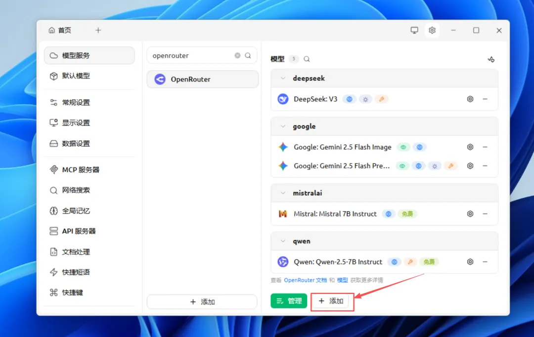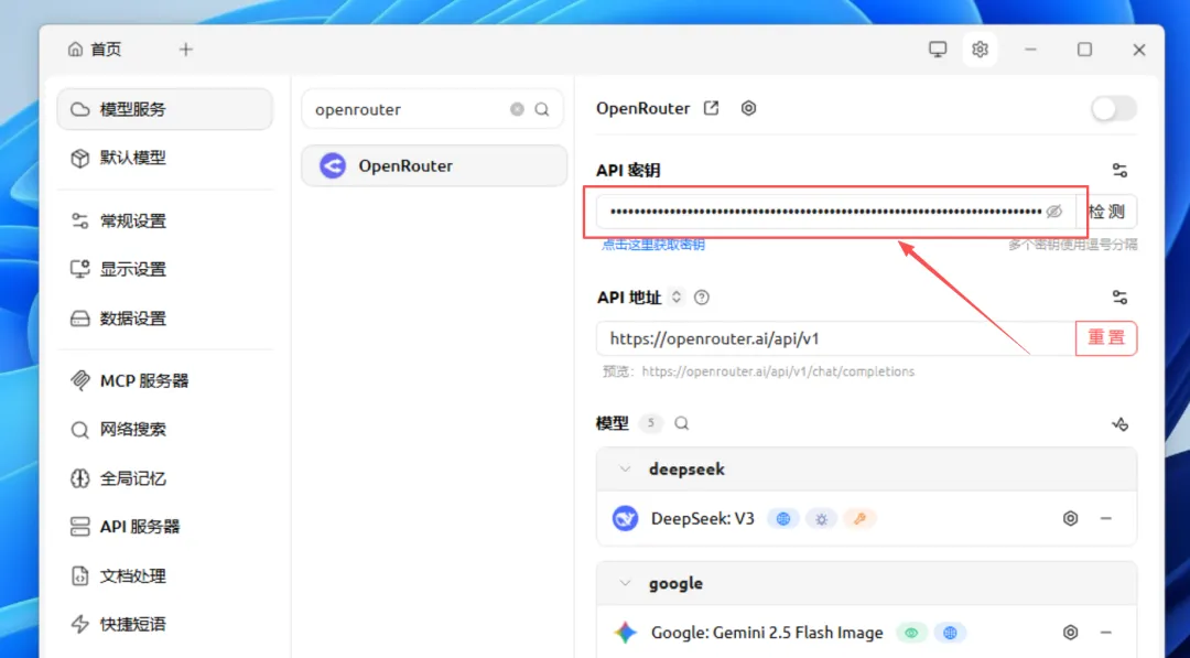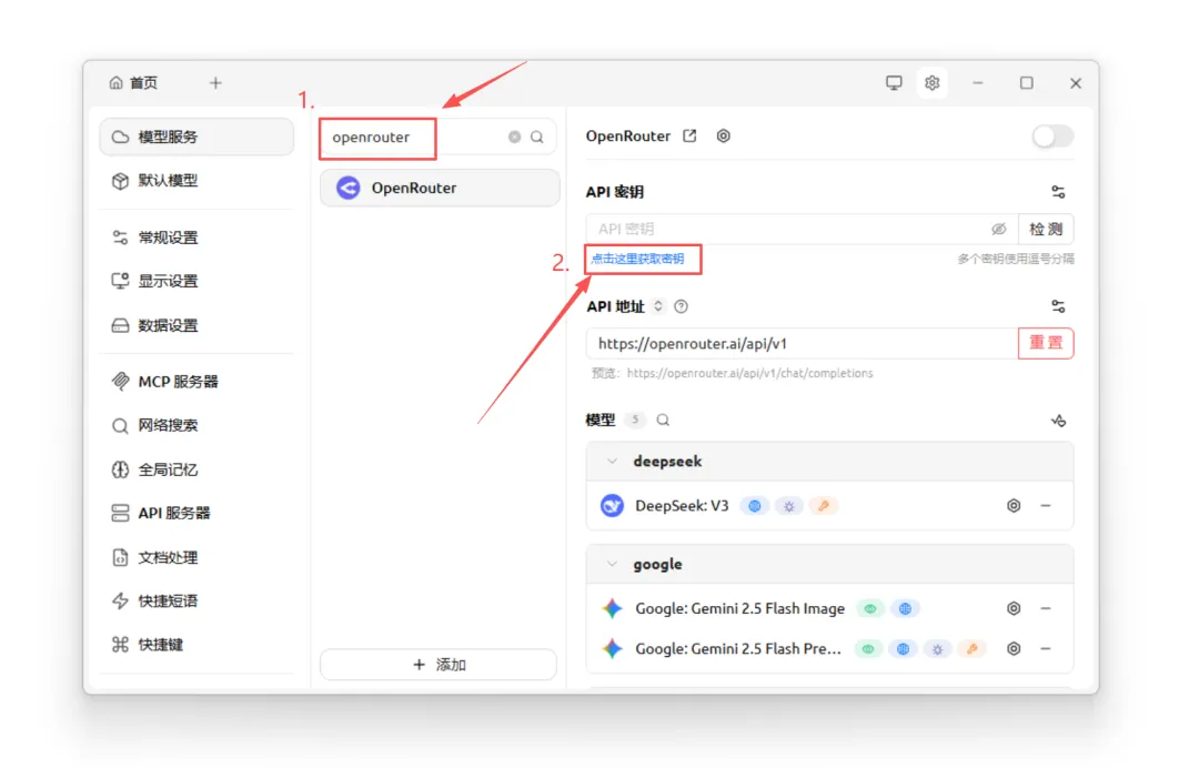 7.搜索:【openrouter】然后选择它,再点点击【获取秘钥】
