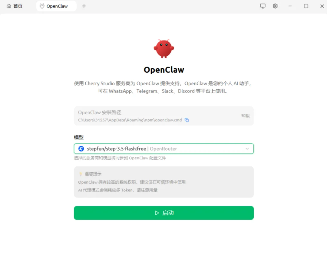 18.模型选择stepfun/step-3.5-flash:free,然后即可启动!