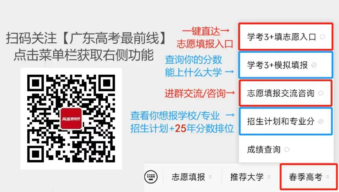 1.关注广东高考最前线公众号,点击【春季高考】-【学考3+填志愿入口】,快速进入填报志愿入口,并输入考生号、密码和验证码登录系统。