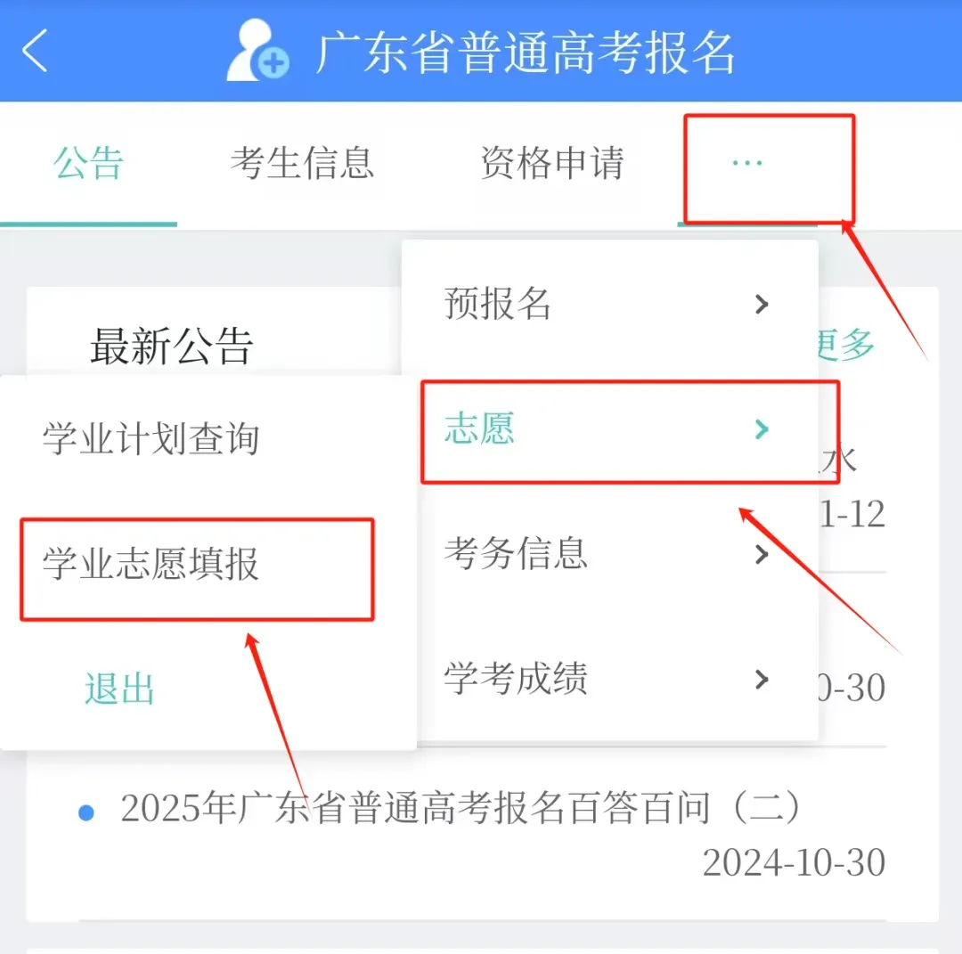 点击右上角三个点,点击【志愿】-【学业志愿填报】,进入志愿填报信息界面。