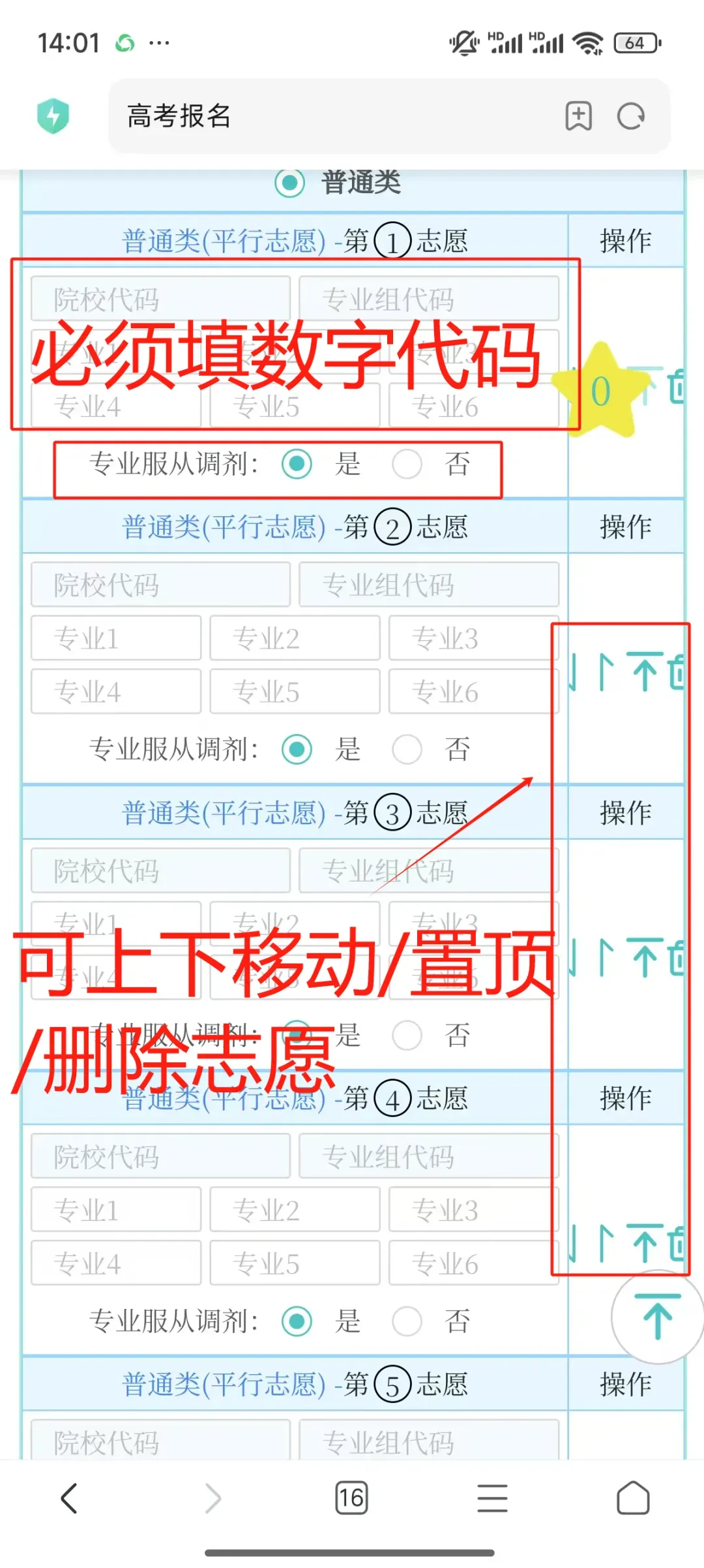 (可利用右手边的箭头上下调整志愿位置)