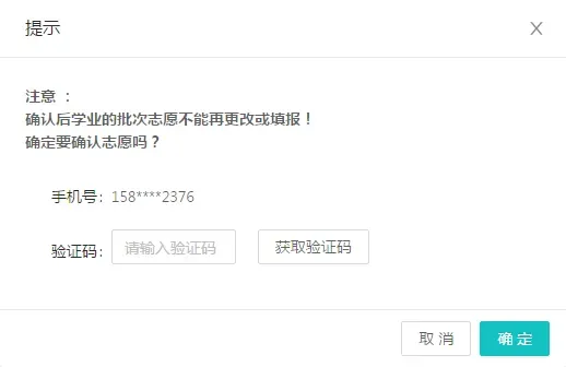 最后须点击“志愿确认”按钮获取短信验证码(发送到高考报名时绑定的手机),输入收到的验证码进行网上志愿确认,即可完成志愿填报。
