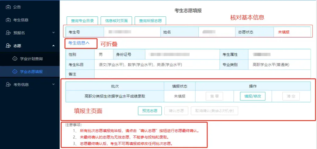 6.关于志愿修改:如未进行网上志愿确认,规定期间内(3月12日14:00至16日12:00)可多次修改所填报的志愿;首次“确认志愿”后,如有需要可最多进行2次取消志愿确认,修改志愿并重新确认志愿的机会。