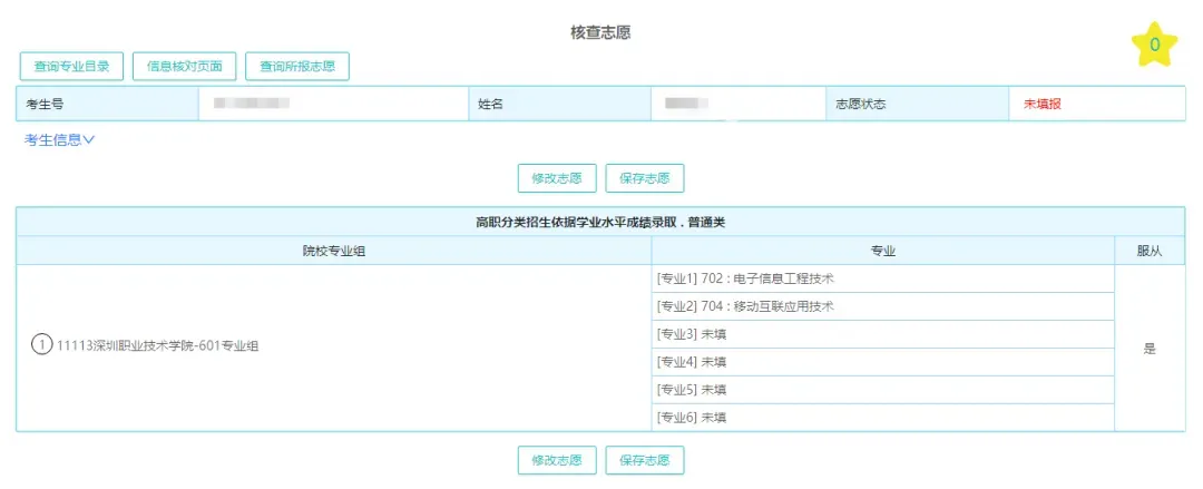 4、填完院校代码、专业组代码和专业代码等信息后,点击“核对志愿”按钮,认真核对自己的志愿是否准确,如有错误,可点击“修改志愿”按钮进行修改。