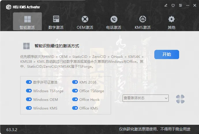 4.进入软件后,各种激活模式,如果是新电脑安装了window10/11系统,或者安装了office软件,选择智能激活,再点击开始即可