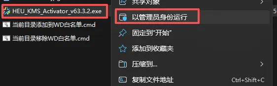1.解压哥白提供的安装包,打开找到【HEU_KMS_Activator_v63.3.2.exe】,点击鼠标右键【以管理员身份运行】