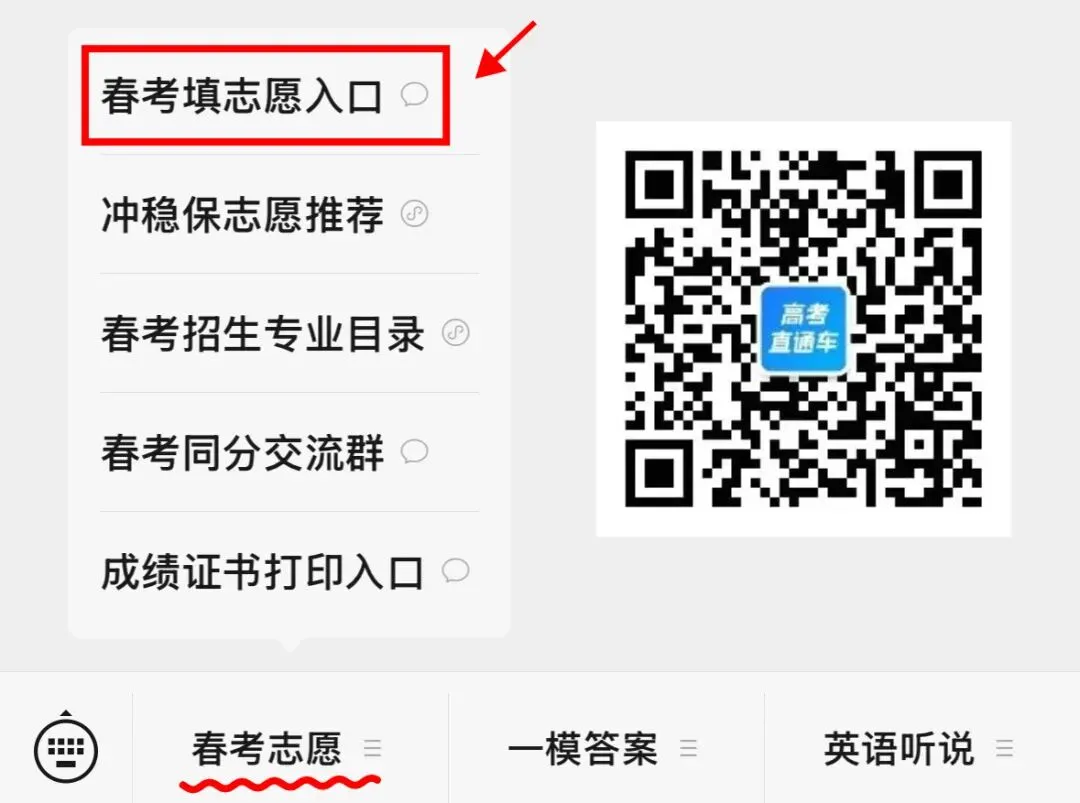 扫码关注【高考直通车】公众号,点击菜单栏【春考志愿】-【春考填志愿入口】。