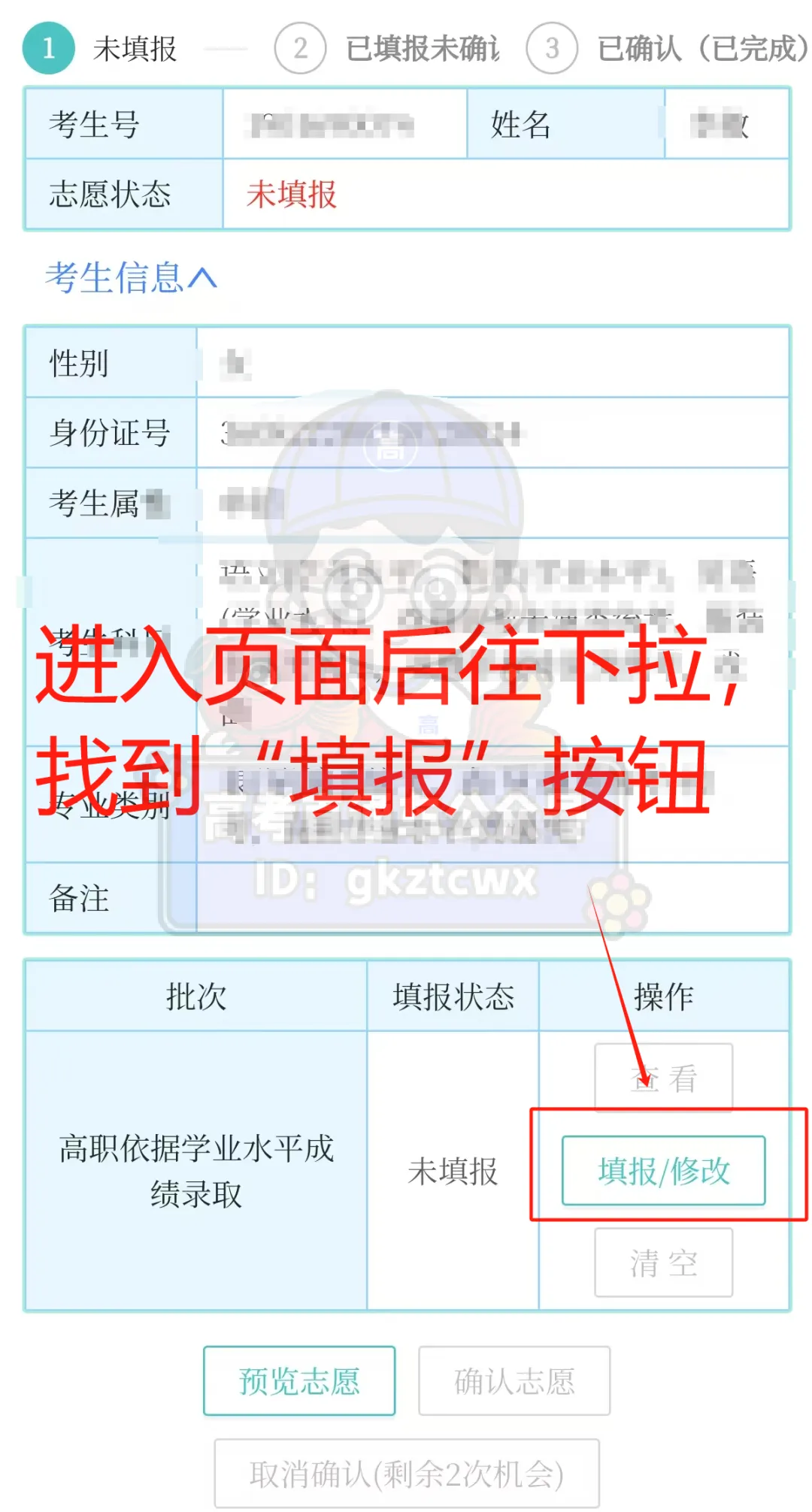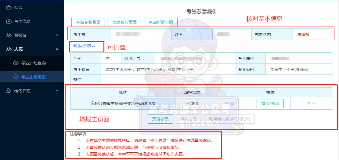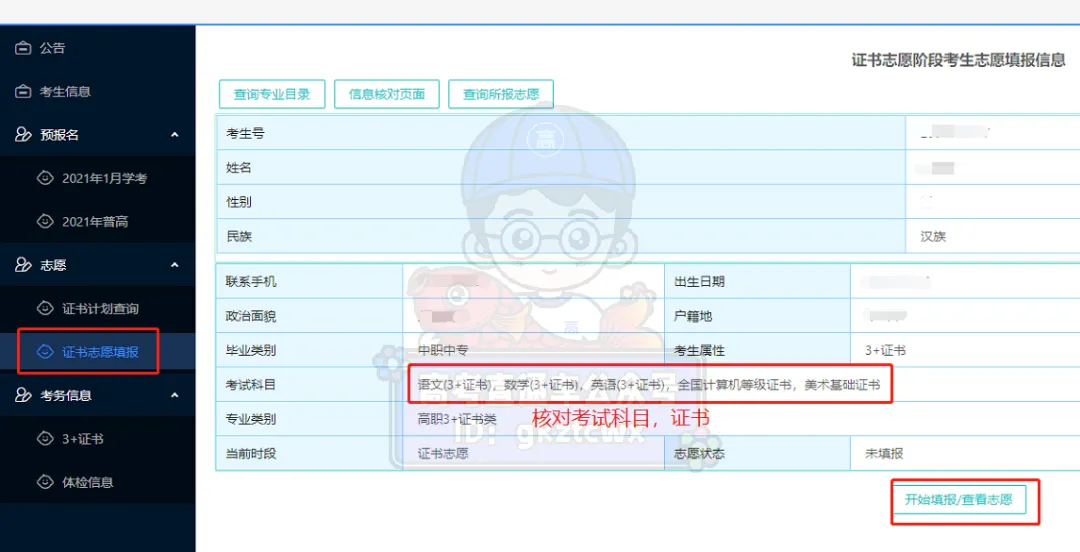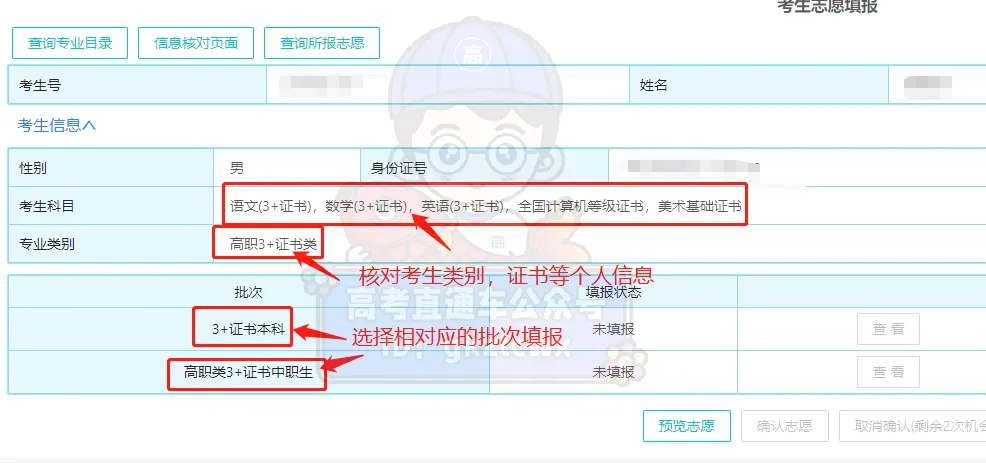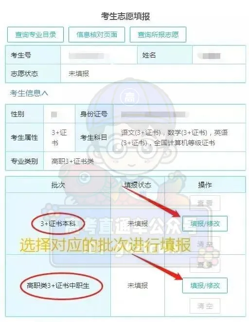 选择【证书志愿填报】,进入【考生志愿填报】页面核实个人信息,并进入对应批次填报。
