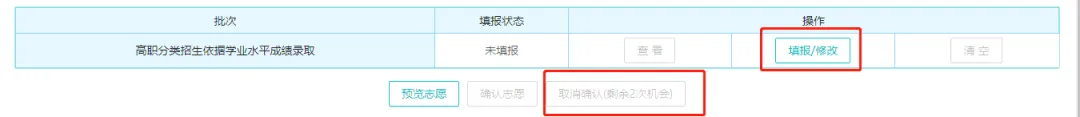 首次“确认志愿”后,如有需要可最多进行2次取消志愿确认,修改志愿并重新确认志愿的机会。取消志愿确认后重新修改的志愿必须再次进行网上确认,否则志愿无效。