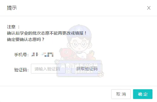需要点击“志愿确认”按钮获取短信验证码(发送到高考报名时绑定的手机),输入收到的验证码进行网上志愿确认,到这一步,就已经完成志愿填报。