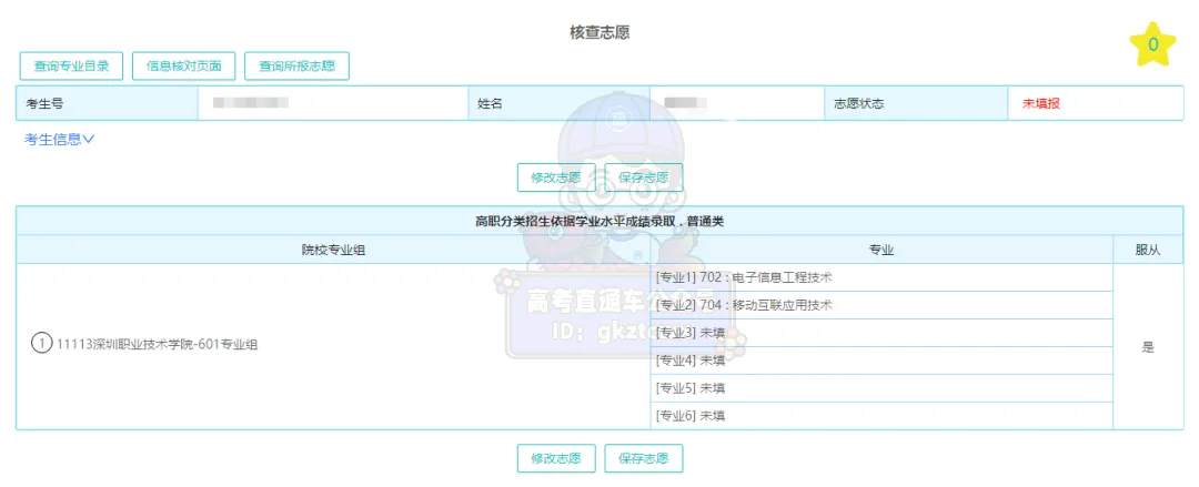 填完院校代码、专业组代码和专业代码等信息后,点击“核对志愿”按钮,认真核对自己的志愿是否准确,如有错误,可点击“修改志愿”按钮进行修改。
