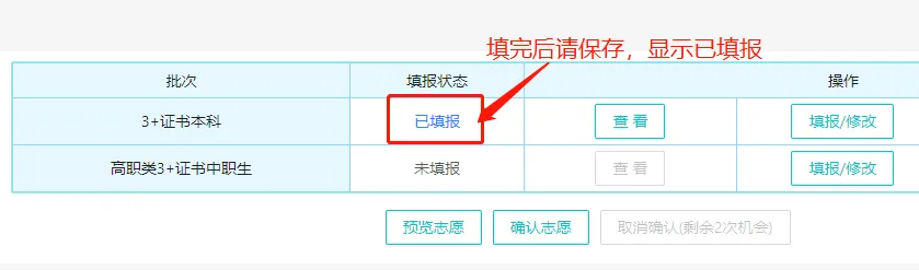 点击保存志愿,填报状态会从【未填报】变为【已填报】。