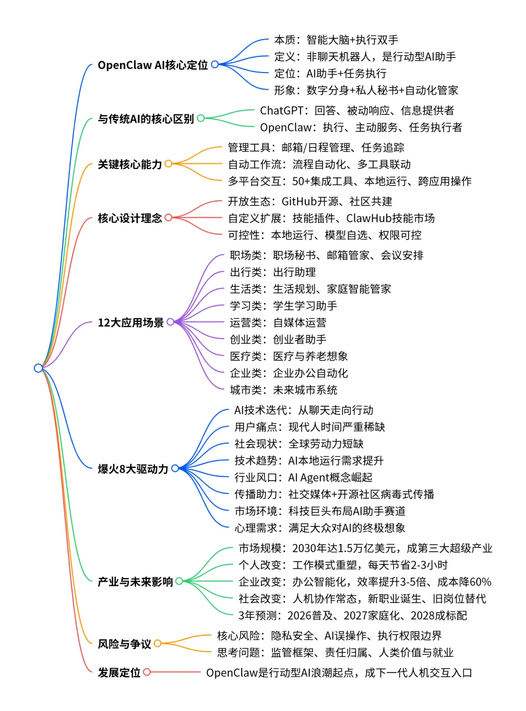 答案:OpenClaw 爆火源于 8 大趋势驱动力,核心是踩中了 2026 年 AI 从 “聊天” 到 “行动” 的技术转折点,同时解决了现代人时间稀缺、全球劳动力短缺的核心痛点,叠加 AI Agent 概念崛起、社交媒体病毒式传播、科技巨头布局等因素,且其本地运行的隐私可控性与贴合大众科幻想象的体验形成了差异化优势;市场方面,2030 年全球 AI 助手市场规模预计达 1.5 万亿美元,成为第三大超级产业;普及节奏上,2026 年快速普及、2027 年进入普通家庭实现家庭化、2028 年成为生活必需品实现标配化。