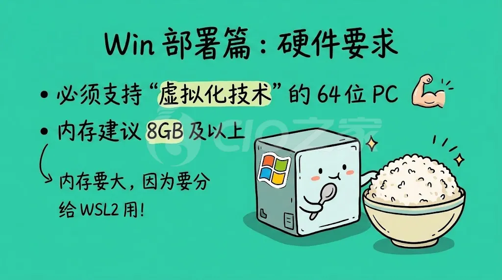 内存建议:建议 8GB 及以上(主要用于为 WSL2 分配充足内存)。