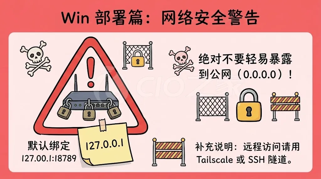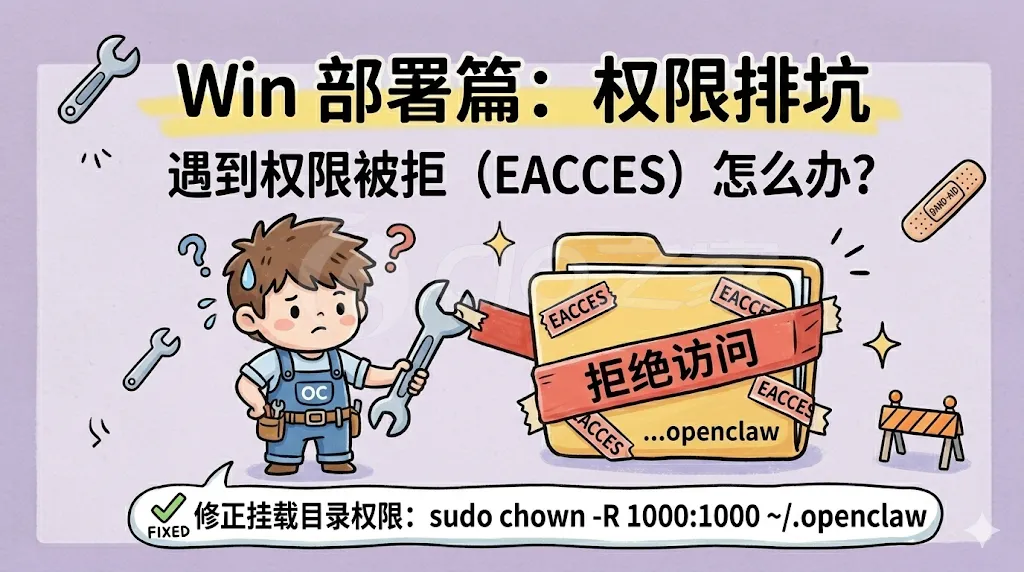 127.0.0.1:18789。切勿在未经授权的情况下将配置修改为暴露到公网(0.0.0.0),建议结合 Tailscale 或 SSH 隧道进行远程访问。沙盒权限:若在 Docker / WSL 混合环境下遇到权限被拒(EACCES),需在宿主机修正挂载目录权限: