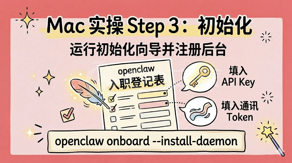 openclaw onboard --install-daemon,录入你的 API 密钥与偏好。验证运行状态:输入