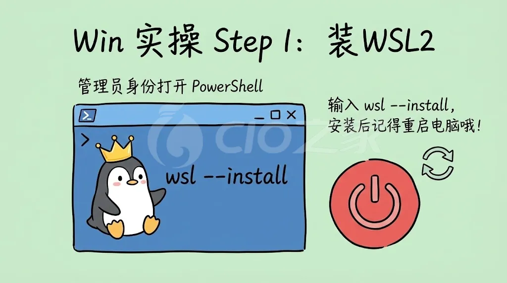 wsl --install安装 WSL2,然后重启电脑。进入 Ubuntu/WSL 终端,运行环境配置命令: