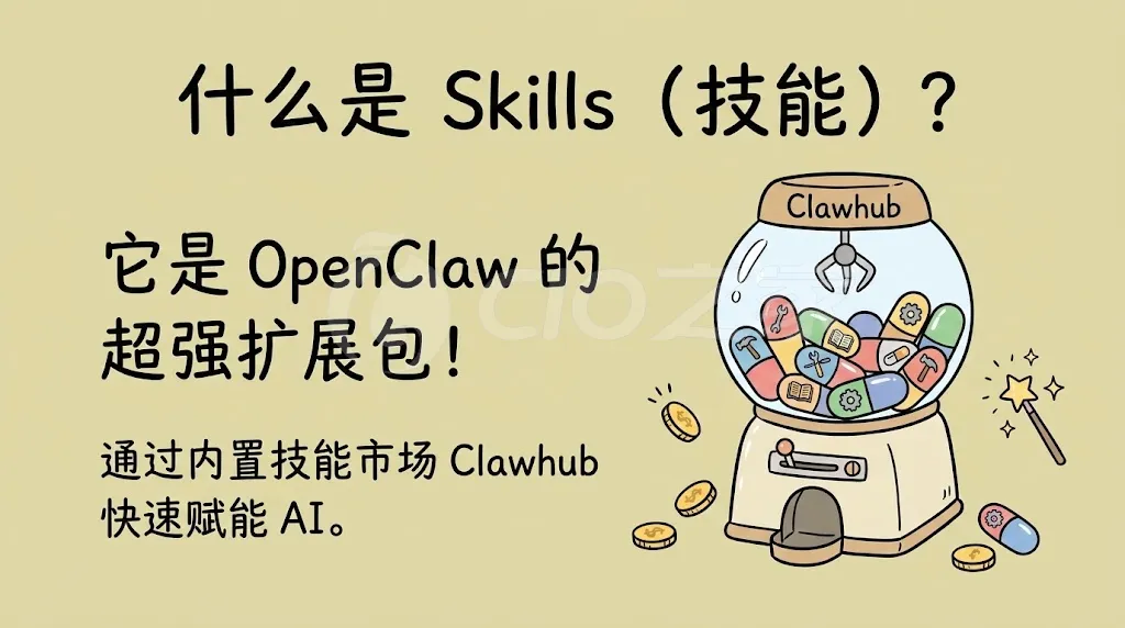 OpenClaw 强大的扩展能力来源于它的技能集(Skills)。你可以通过其内置的技能市场 Clawhub 快速赋能 Agent。