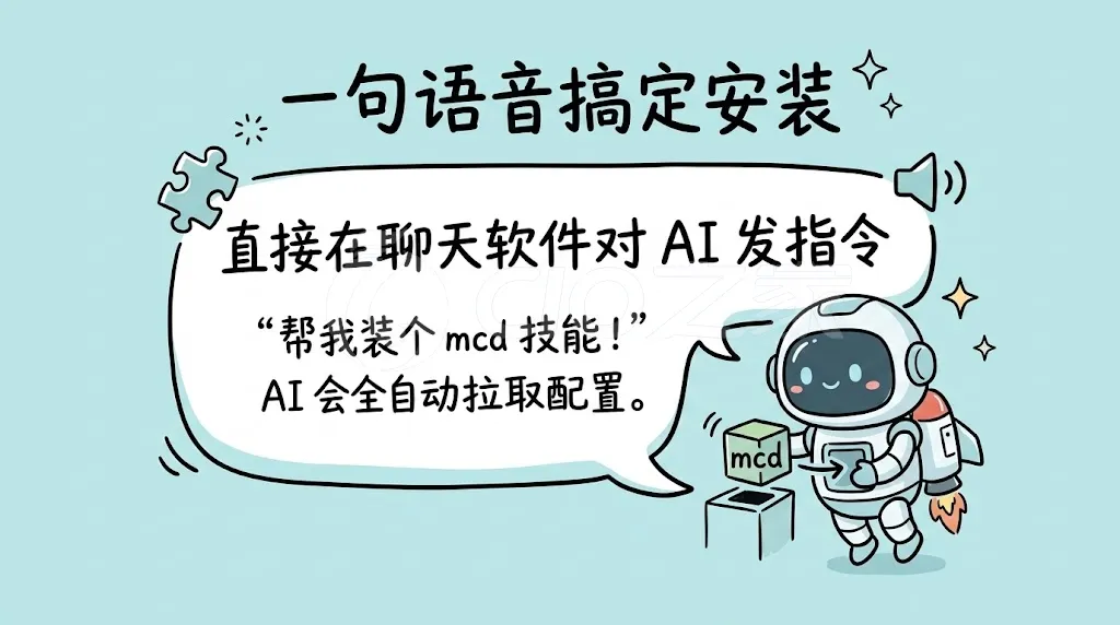 交互式安装(推荐):在你接入的聊天软件(如 Telegram)中,直接向 OpenClaw 发送自然语言指令,例如:“Please install a skill for me using Clawhub; its name is mcd.”。Agent 会自行联网拉取、配置并热重载该技能,无需你手动改代码。