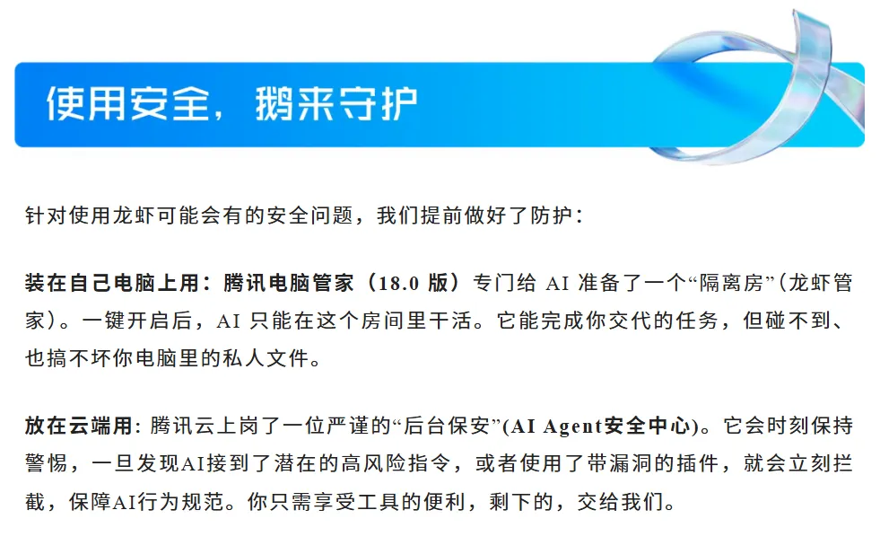 更关键的是,针对此前引爆全网的安全焦虑,腾讯也给出了相关的硬核解决方案:无论是装在自己电脑上,还是放在云端用,都已经提前做好防护!