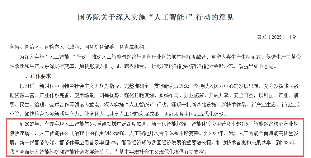 2025年8月,国务院发布《关于深入实施“人工智能+”行动的意见》,为新一代智能终端、智能体等应用普及率设定明确指标:到2027年,普及率超70%;到2030年,进一步增至90%以上。