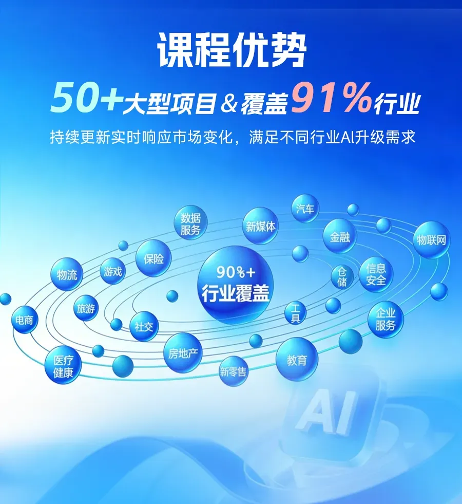 50+大型项目&覆盖91%行业,项目实战课程占比超60%超全项目实战库持续更新,实时响应市场变化,满足不同行业AI升级需求。