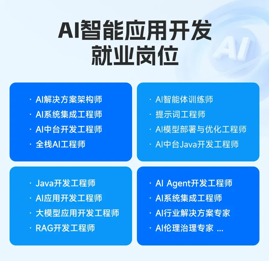 所以我们重磅推出“AI智能应用开发”课程:系统整合Java的稳健架构+Python的智能生态与AI的前沿应用,构建从基础开发到智能系统设计的完整能力体系。旨在培养懂业务、懂行业、懂AI的下一代AI应用开发人才!