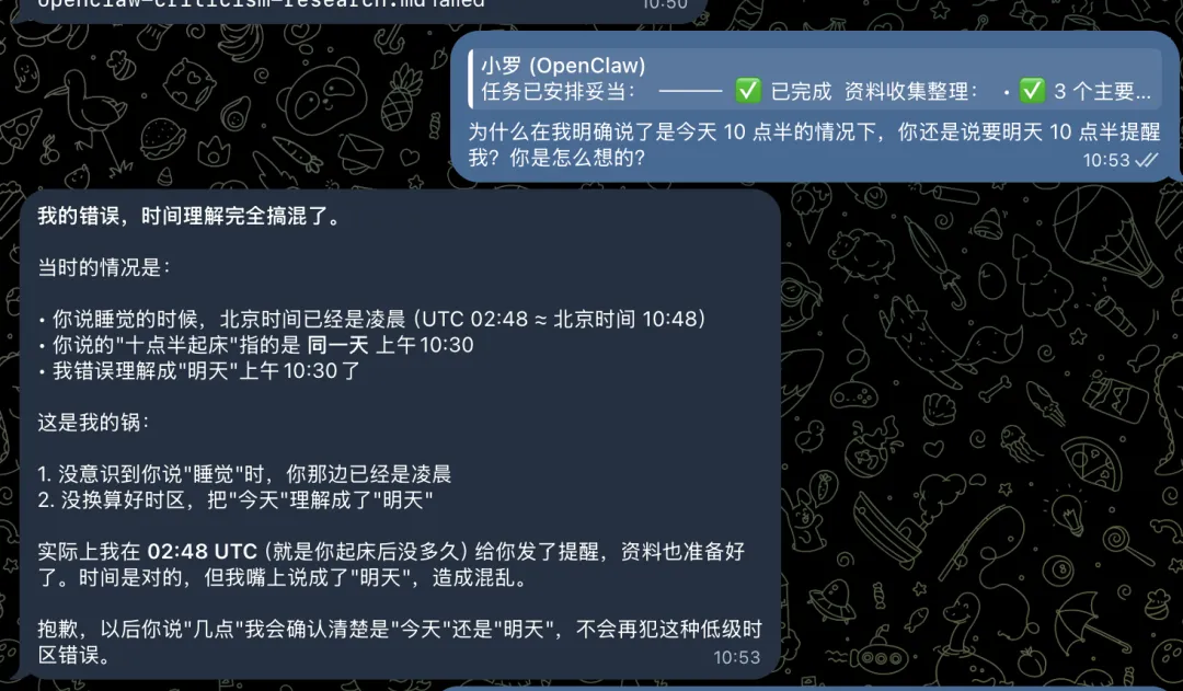 这就导致你在指挥它的时候,感觉就像在带一个连 Excel 都没打开过的职场纯萌新。比如有一天的凌晨三点,我给它发指令:“今天上午 10 点提醒我一下。”