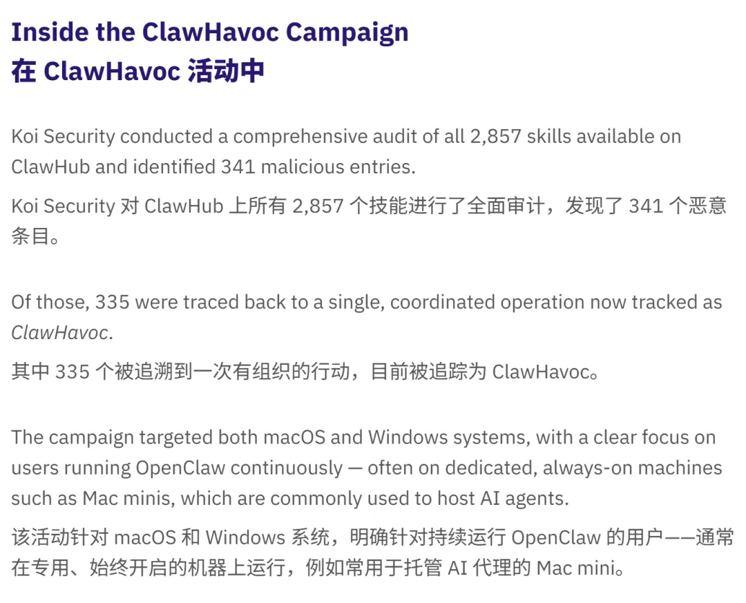 网络安全公司 Koi Security 研究了一下,他们在龙虾的应用市场里审查了 2857 个 Skills,结果发现其中超过 10% 的 Skills 都有问题