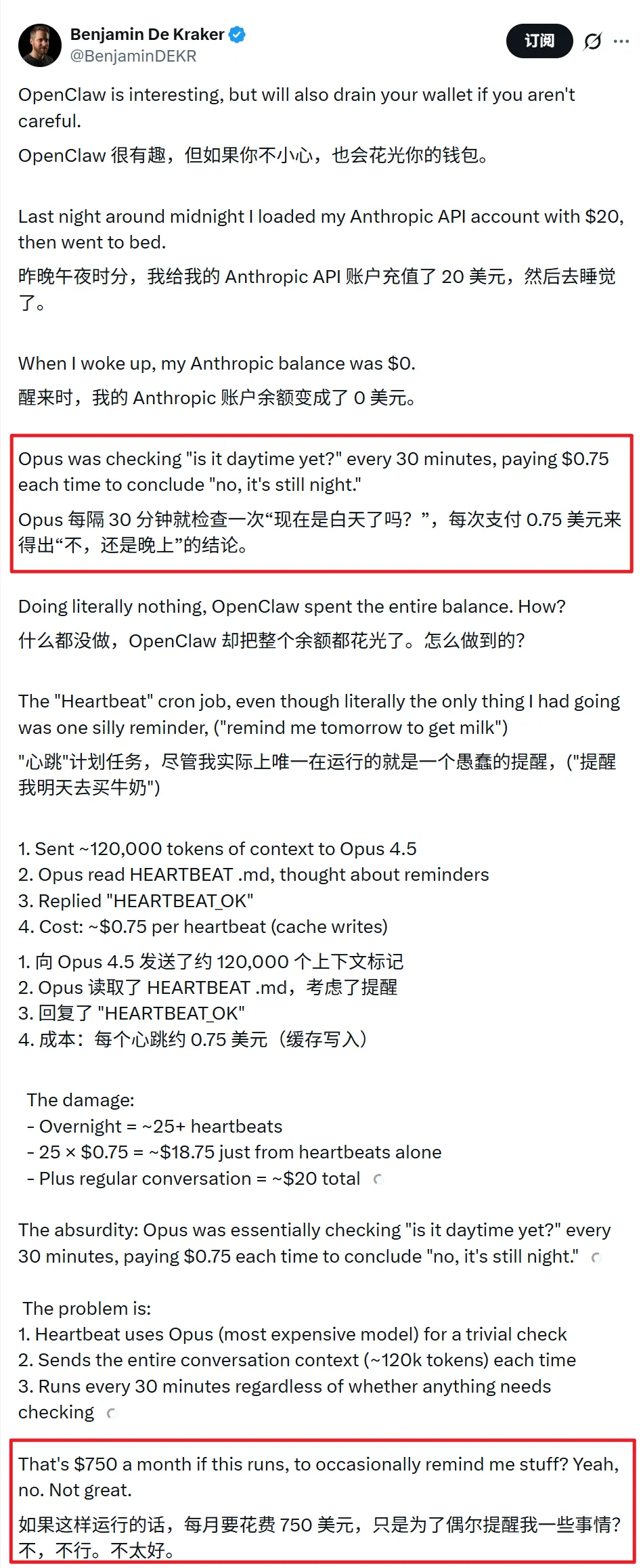 腾讯那边的免费安装 OpenClaw 活动上周五刚办完,周六就有人发帖说自己的免费额度已经给用完了,一天不到就倒欠十几块钱了。