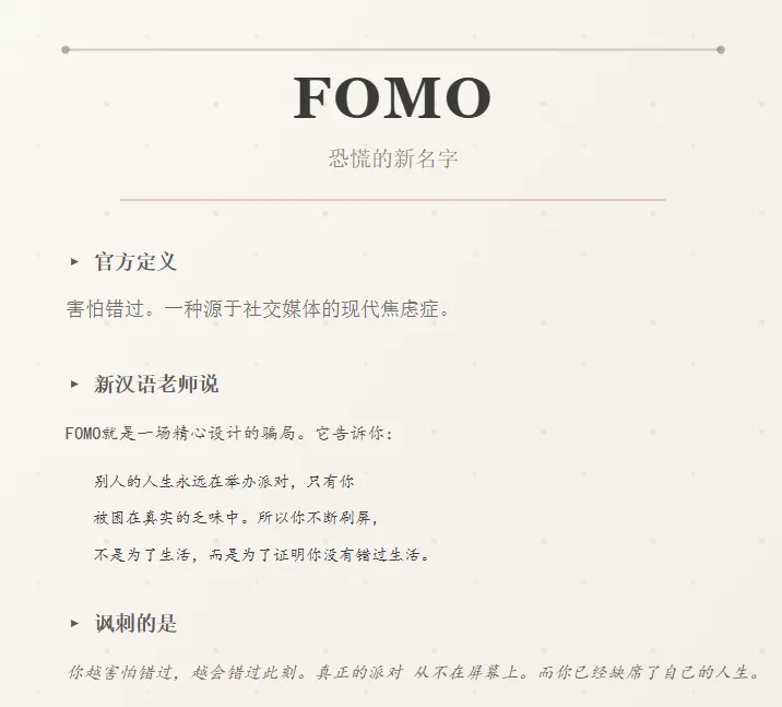 这种感觉其实有个专业名词,叫 FOMO,也叫错失恐惧症,在 AI 时代尤其严重。