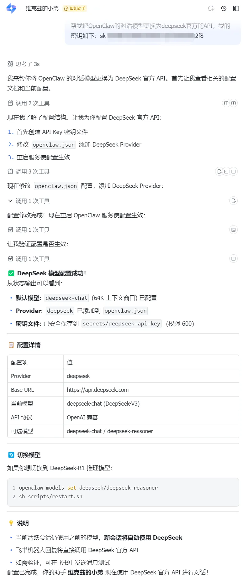 如上,我想让它帮我切换成DeepSeek的模型,等待结果: