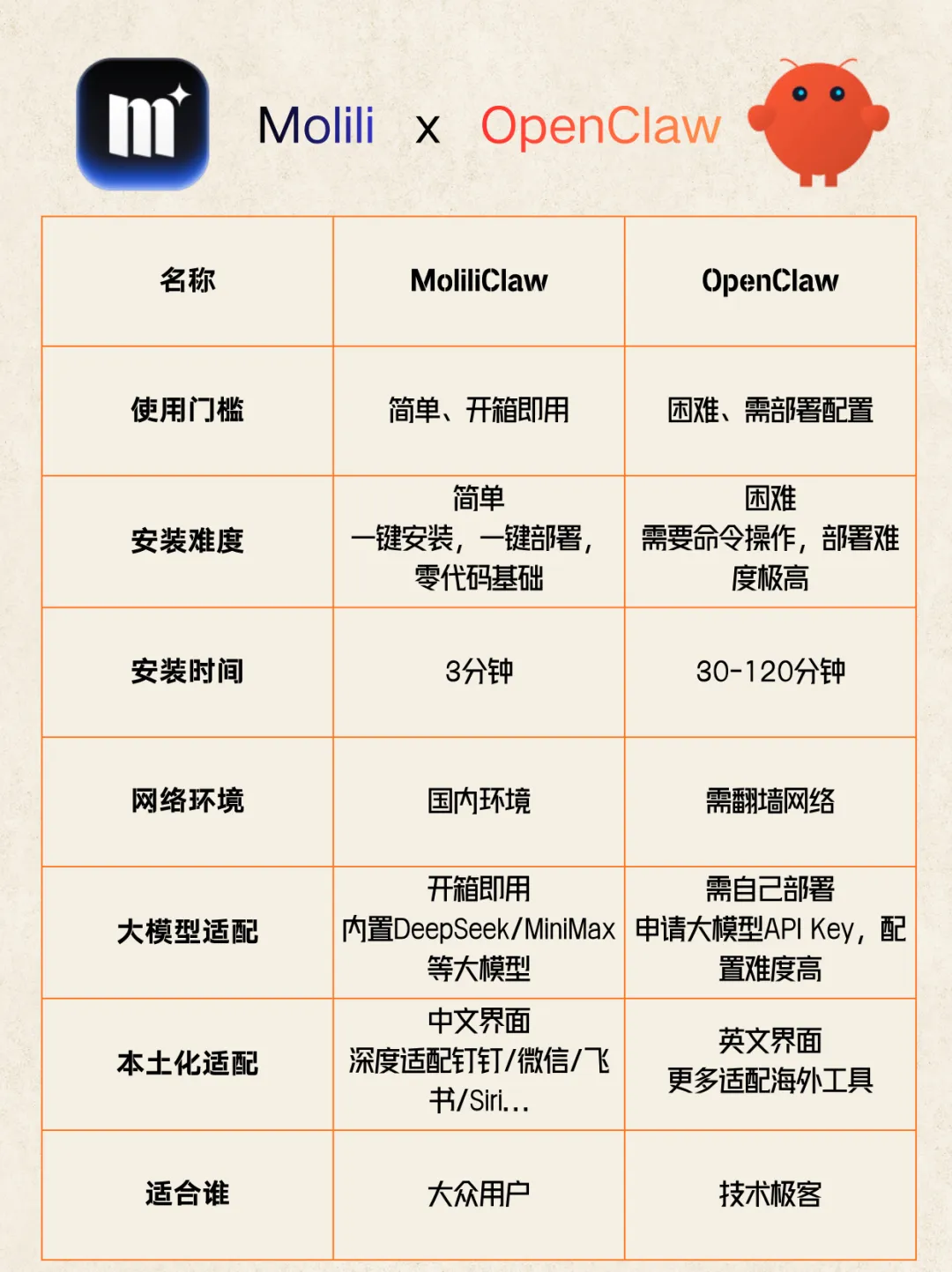 下面,从功能定位、使用场景、技术适配等维度,系统拆解 MoliliClaw 与 OpenClaw 的核心差异。