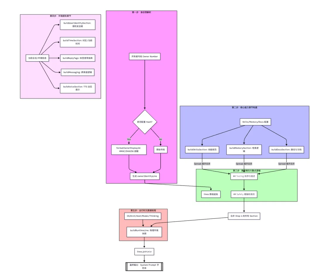 1. 拼接系统提示词:buildAgentSystemPrompt 2. 构建运行时:buildRuntimeLine