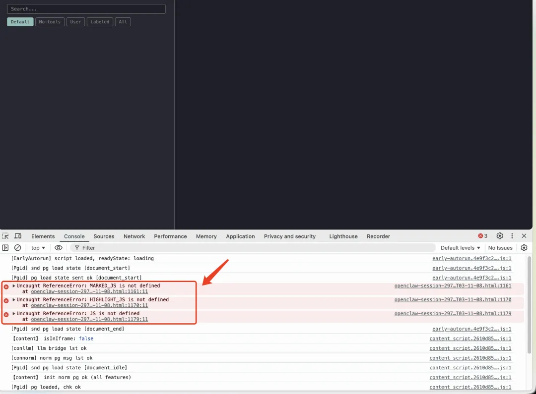 return template .replace("{{CSS}}", css) .replace("{{JS}}", templateJs) .replace("{{SESSION_DATA}}", sessionDataBase64) .replace("{{MARKED_JS}}", markedJs) .replace("{{HIGHLIGHT_JS}}", hljsJs);也就是,html 模板中存在占位符: