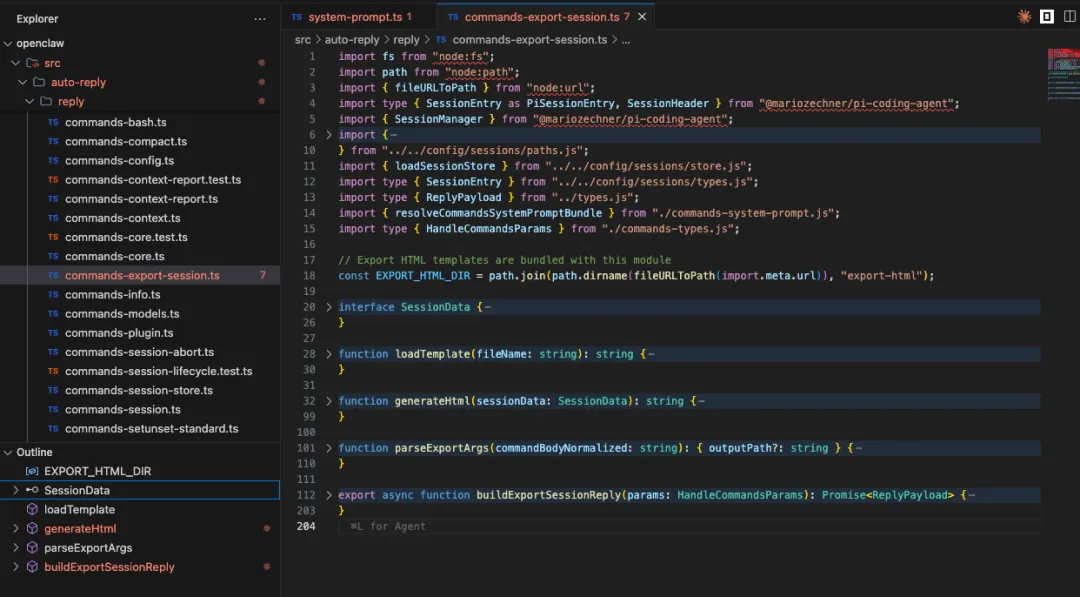 1. 解析参数:解析用户输入的路径,如果用户没提供路径,则默认在当前工作区生成一个带时间戳的文件。 2. 定位会话文件:从 SessionStore 中找到当前会话对应的本地 .jsonl 文件路径。 3. 加载数据: • 使用 SessionManager 加载所有对话条目 (entries)。 • 调用 resolveCommandsSystemPromptBundle 获取当前会话使用的系统提示词 (System Prompt) 和 工具定义 (Tools)。 4. 组装数据 (SessionData):将页头信息、对话记录、提示词和工具列表封装进一个对象。 5. 生成 HTML:调用 generateHtml 函数填充模板。 6. 写入文件:确保目标目录存在,并将生成的 HTML 写入磁盘。 7. 返回结果:向用户反馈导出成功的消息,包括文件路径和统计信息(条目数、提示词长度等)。
