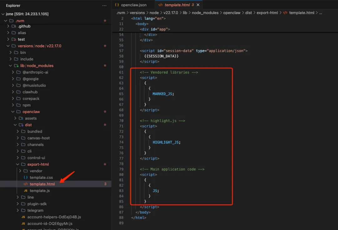 直接 node 安装的话:/xxx/node_modules/openclaw/dist/export-html/template.html