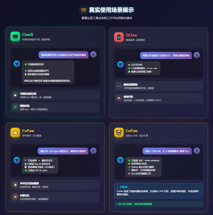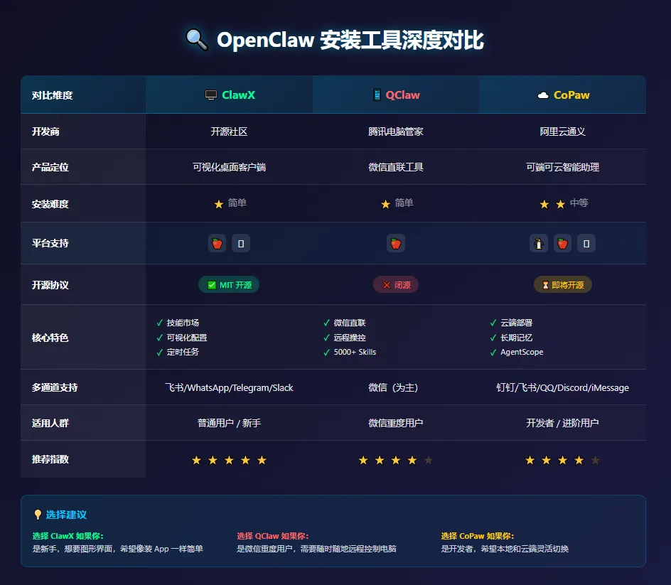 想要简单 → 选 ClawX,点点鼠标就能用 想要便捷 → 选 QClaw,微信扫码随时控 想要灵活 → 选 CoPaw,本地云端任切换