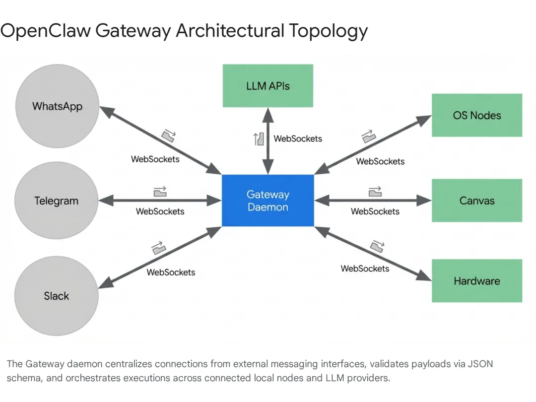 OpenClaw 网络架构的核心是一个长期运行的进程,称为网关守护进程。4该网关充当所有连接的消息传递表面、工具执行和外部 API 调用的中央路由器、状态管理器和控制平面。5默认情况下,网关绑定到特定的本地主机接口(具体来说是 127.0.0.1:18789),并管理强类型的 WebSocket 应用程序编程接口。4为了确保协议完整性,网关在处理所有入站网络帧之前,会根据严格的 JSON 模式对其进行验证。4