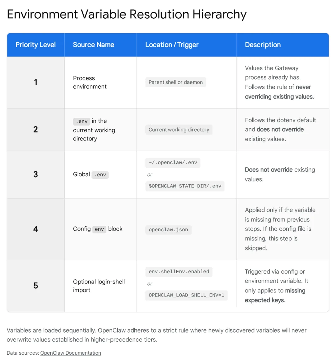 系统会按照非常特定的顺序解析配置指令。21OpenClaw 遵循永不覆盖现有值的基本规则;优先级更高的变量始终优先,后续层级只会填充缺失的键。21