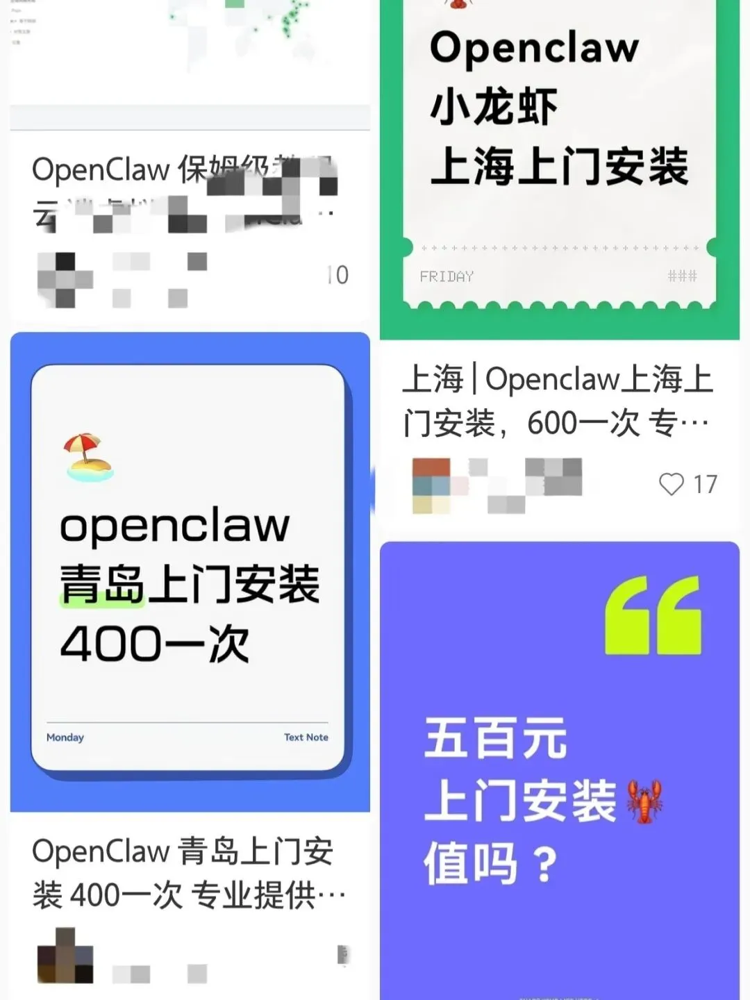 闲鱼和小红书上,OpenClaw上门安装的报价从几十元至几千元不等。