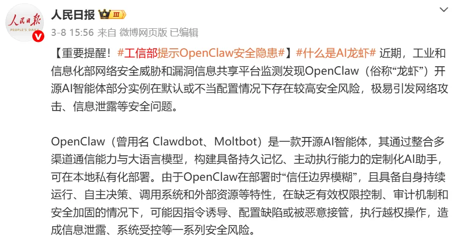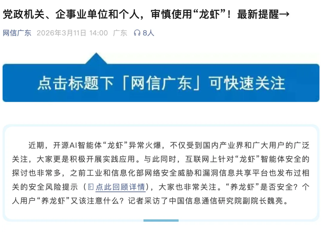 工信部、国家互联网应急中心相继发布预警,中国信息通信研究院副院长魏亮呼吁,党政机关、企事业单位和个人用户要审慎使用"龙虾"等智能体。