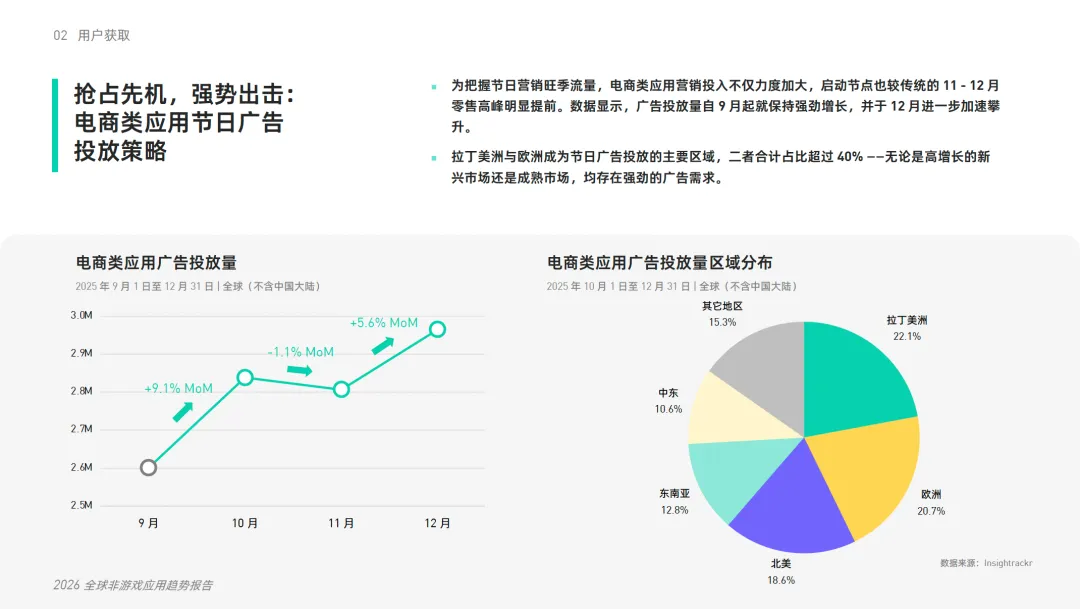 报告数据显示,拉美+欧洲两个市场,贡献了节日季超过40%的广告投放量。而且不是简单砸两天,是从9月一直持续投到12月冲顶。整个战线拉长了一倍还多。