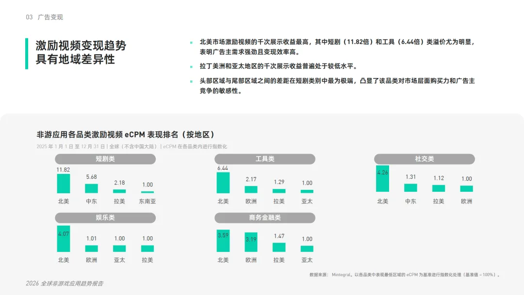 报告数据显示,AI社交应用在iOS端的变现指数高达基准的2.8倍,激励视频和插屏视频的eCPM全球最高。这说明什么?北美用户不仅愿意花钱订阅,还愿意看广告——付费+广告两头吃,这才是真香。