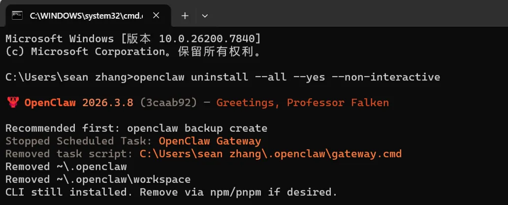 2.执行一键卸载命令(复制粘贴,回车即可):openclaw uninstall --all --yes --non-interactive