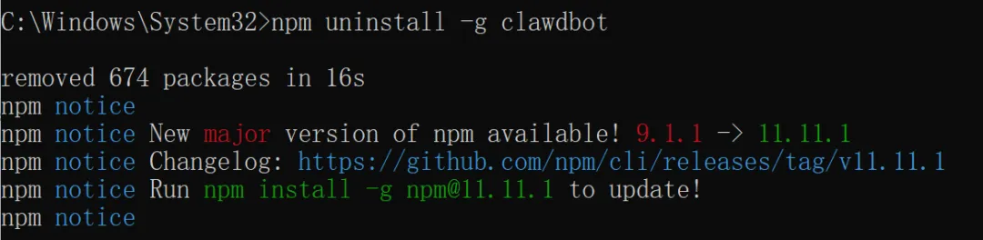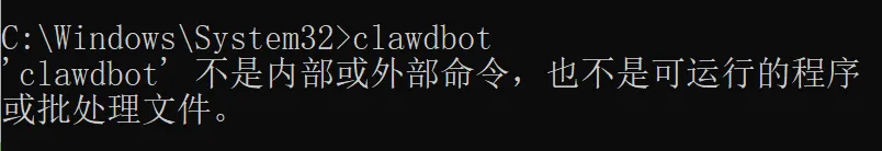 此时输入 clawdbot,如果系统提示“不是内部或外部命令”,说明程序主体已卸载。