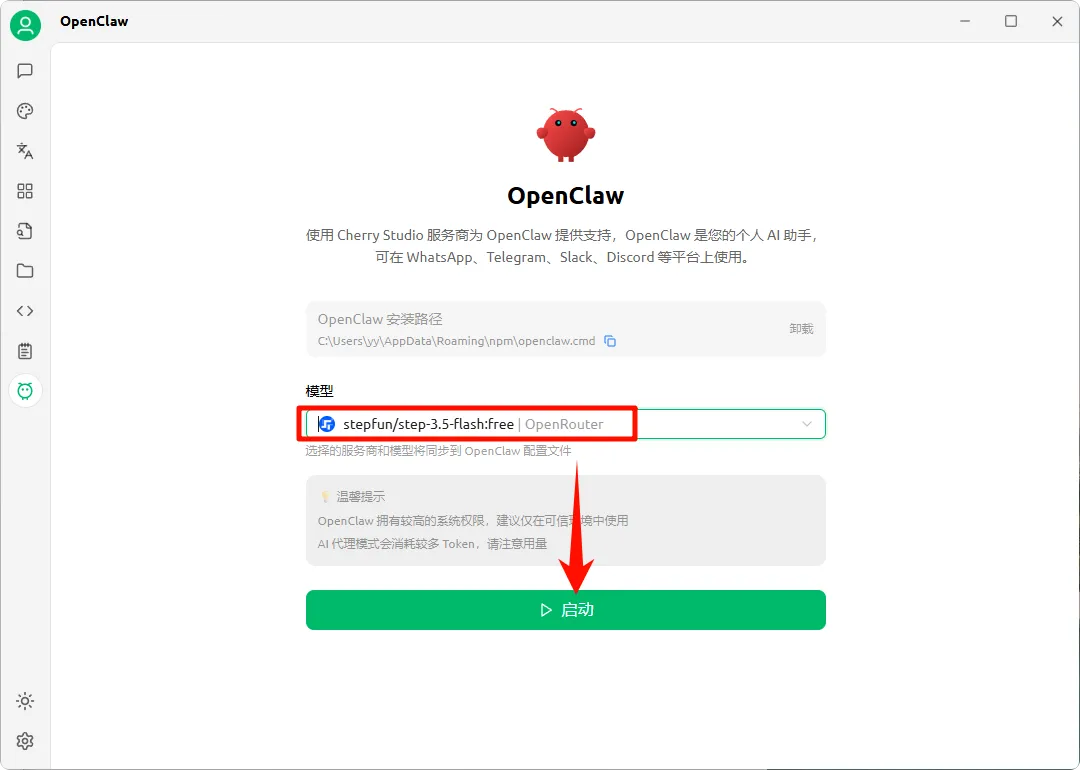 OpenClaw免费小白安装教程来了!解锁你的第一个龙虾��最近非常火的小龙虾(OpenClaw)大家都用了吗?现在很多人都在安装龙虾,但我发现一个很关键的问题:大多数人还把它当成加强版ChatGPT。就是这个认知偏差,会让你实际用起来特别迷茫,最后干脆放弃。龙虾的核心,根本不是ChatGPT。ChatGPT更像一个线上顾问,你问一句它答一句,关掉对话框就停止工作,没有操作能力,也不会主动干活。龙虾则是真正能干活的助手,接到任务就会自动执行。就算你合上电脑,它也能在后台继续运行,操控鼠标、文件和浏览器,从抓取数据到编写代码,都能帮你把任务完成。想必很多小伙伴都还云里雾里不知道怎么安装吧?今天就专门给大家安排一期安装教程,手把手教你安装部署!注意:推荐大家使用虚拟机安装。 一、安装Cherry Studio首先需要在电脑上安装Cherry Studio客户端,它是一款开源的跨平台AI集成客户端,聚合了很多主流的大语言模型,现在也加人了快速安装OpenClaw的功能!地址:https://www.cherry-ai.com/download这个安装很简单,只需要点击安装包,勾选为任何人安装并点击下一步,然后选择一个安装位置并点击安装。安装成功后运行即可。 二、配置OpenRouter step模型打开Cherry Studio软件,找到设置图标并点进去,在模型服务中找到“OpenRouter”这个模型,然后获取密钥,如下图:这个时候会跳转一个网页,大家需要先注册登录一个账号,登录后点击获取密钥。然后点击“Create”创建一个API Key,这里的名称可以随便填写,但一定要注意创健成功后弹出的密钥窗口,这个窗口指挥弹出一次,所以要将密钥复制保存下来。然后回到Cherry Studio客户端,将刚刚复制的密钥粘贴进去。随后在这个页面往下滑,找到添加并点击。输入【stepfun/step-3.5-flash:free】并添加模型。再回到首页,选择这个【stepfun/step-3.5-flash:free】模型。再随便测试一下,没问题的话这一步就完成了,接下来就可以配置“龙虾”了。 三、配置OpenClaw点击侧边的小图标就可以进入安装页面了,要先记得安装下面的“Node.js”和“Git”,最后才安装“OpenClaw”,图中也给大家将顺序标出来了,跟着操作就行。需要安装的东西安装好后,就可以开始安装OpenClaw了。安装成功后,在模型处选择【stepfun/step-3.5-flash:free】,最后点击启动就可以了,非常简单。接下来就可以使用了。⚠️注意:安全性的问题不少小伙伴都会问OpenClaw的安全问题,确实现在关于它的潜在安全风险,讨论和提醒也越来越多。OpenClaw是一个Agent,只能在你信任的环境中使用,不要让它执行你看不懂的指令,也不要把重要的账号密码放在它能访问的位置。再次建议感兴趣的小伙伴,尽量用虚拟机安装!本号致力于把最好的软件免费分享给大家