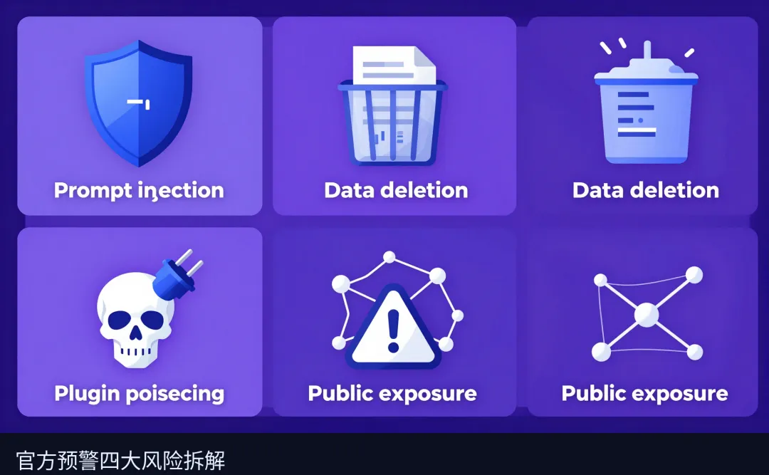 1. 提示词注入泄密钥:诱导AI读取带恶意指令的网页,直接盗走你环境里的所有API密钥,盗刷欠费是分分钟的事 2. 误操作乱删数据:识别错指令,把你存了几年的工作邮件、项目文件一键清空,连回收站都不进 3. 插件投毒成肉鸡:第三方Skill商店根本没人审核,装个“自动发邮件”插件,实际在后台偷你密码当肉鸡 4. 公开高中危漏洞:已经曝了好几个无权限访问漏洞,公网暴露的机器,直接被攻击者接管
