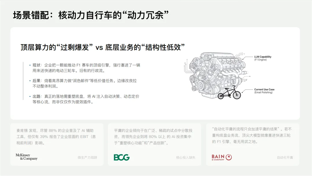 张帆老师一针见血地指出,很多人反过来说大模型不靠谱,但却没有想过,问题其实不在于发动机,而在于那辆底盘薄弱的“三轮车”。我们正试图用高昂的智能算力去给低效的传统业务流程打补丁,这注定是一场无用功。