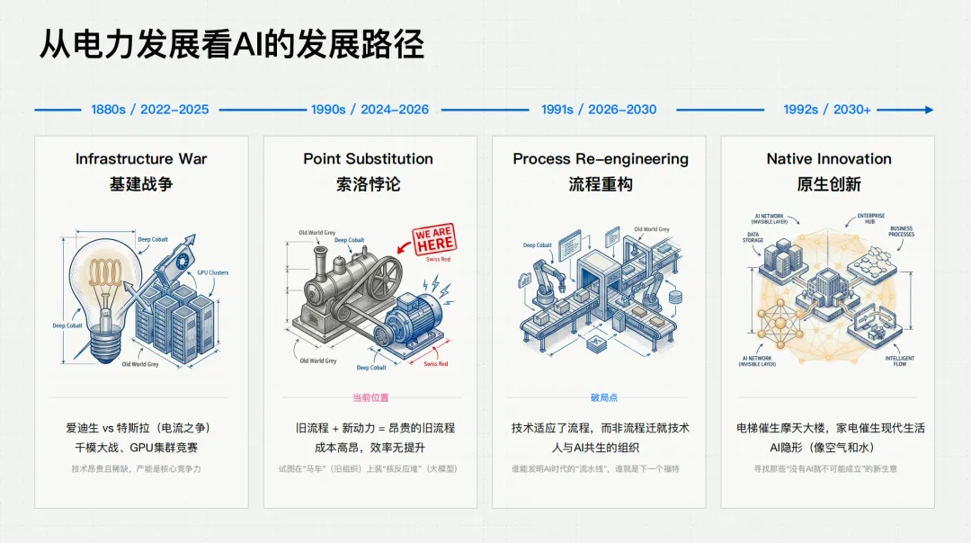 为了看清大模型的未来,张帆老师带我们穿越回了一百多年前的“电力革命”。